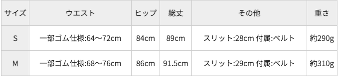 尺寸 :  (S)腰圍[部份鬆緊帶]64~72  臀圍84  全長89  其他 : 開衩28  附屬品 : 腰帶  重量290g